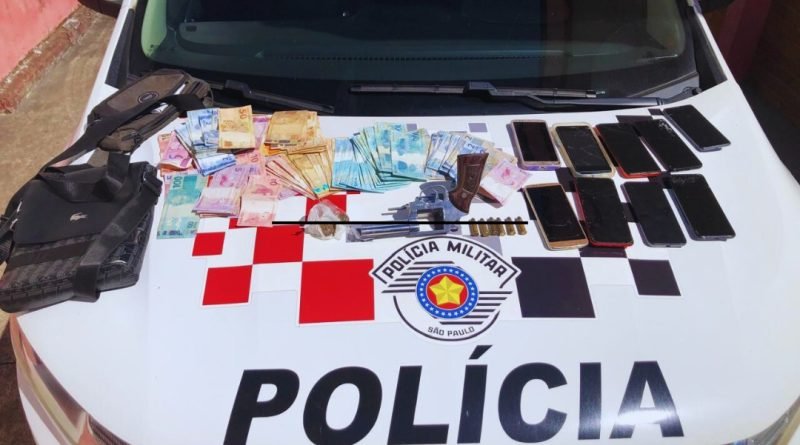 Após tomarem conhecimento do fato, policiais militares do município, com apoio de viaturas de Força Tática imediatamente foram para a cidade, patrulharam e localizaram dois homens com um revólver calibre .38, munições, dinheiro, vários aparelhos celulares e uma porção de droga.