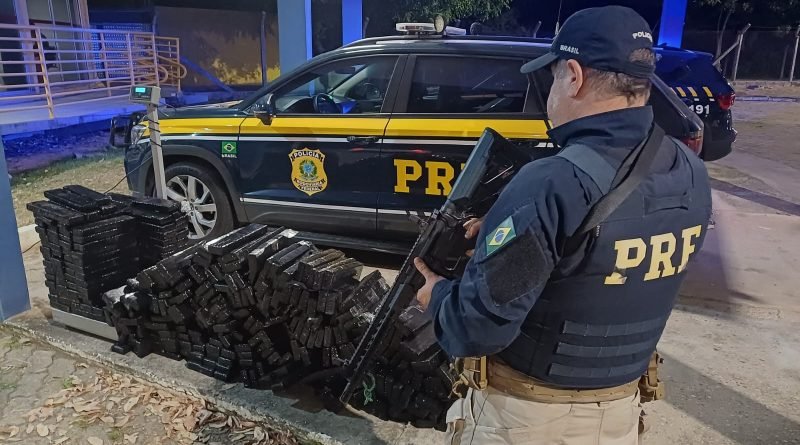 Durante vistoria no veículo, os policiais encontraram grandes tabletes de maconha no porta malas, totalizando 335 quilos da droga.