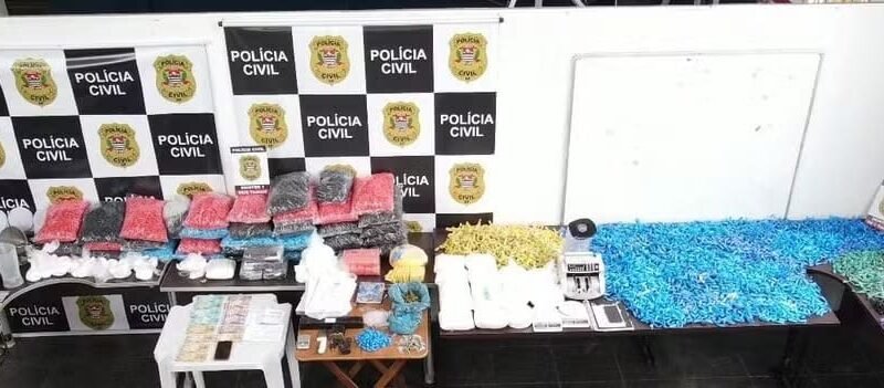De acordo com a Polícia Civil, a apreensão total foi de mais de sete mil pinos de cocaína, quatro tijolos de pasta base de cocaína, 197 pedras de crack, porções de maconha, três carros, uma moto e cerca de R$ 6 mil em espécie.