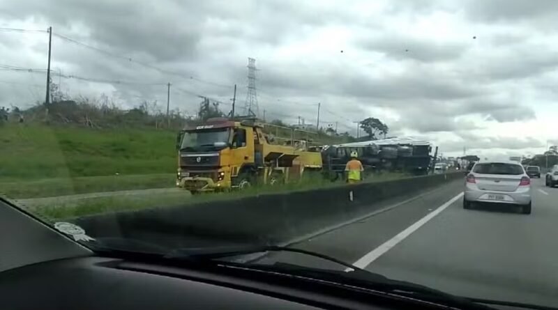 Caminhão tomba e espalha carga de pães, causando congestionamento na Dutra em Caçapava
