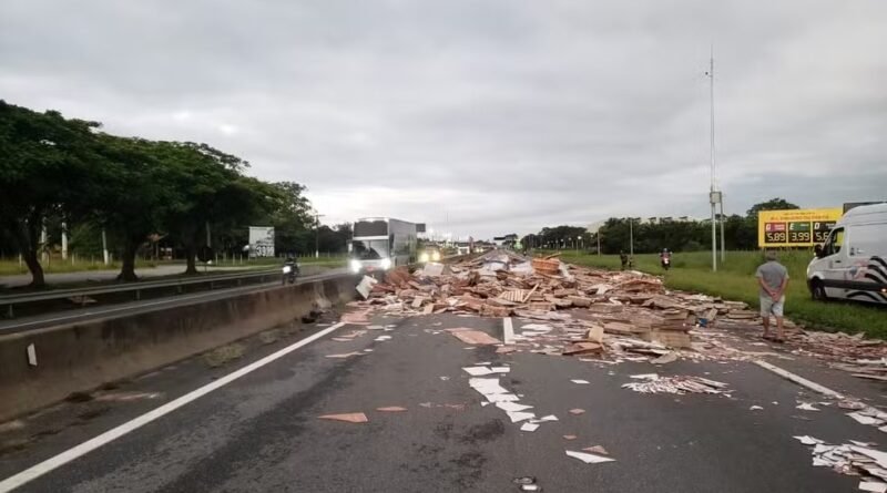 Na manhã desta sexta-feira (10), a Rodovia Presidente Dutra ficou totalmente interditada por 1h40 devido a um acidente envolvendo um caminhão e uma carreta no limite entre Lorena e Guaratinguetá. A colisão, ocorrida por volta das 6h no km 57, sentido São Paulo, provocou a queda de uma carga de pisos, que se espalhou pelas duas faixas e pelo acostamento.