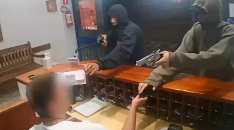 Dois homens armados invadiram um hotel na noite de quarta-feira, 2 de abril, em Aparecida (SP), renderam o recepcionista e roubaram dinheiro do caixa. Toda a ação foi registrada por câmeras de segurança do local.