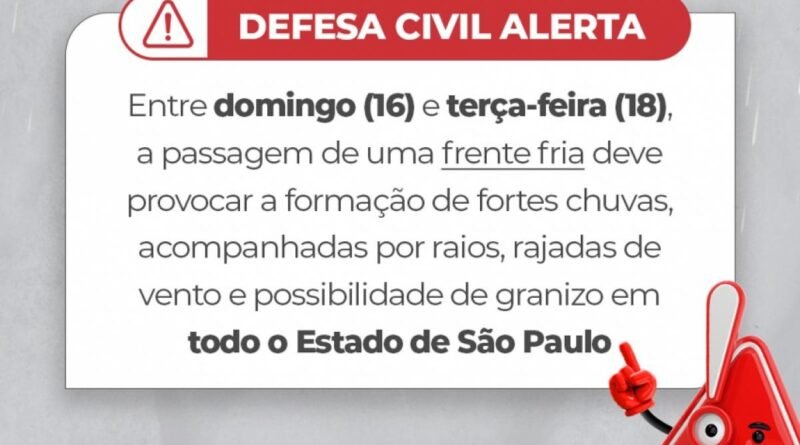 Read MoreA Defesa Civil do Estado de São Paulo emitiu um alerta para a ocorrência de chuva forte, ventos intensos e